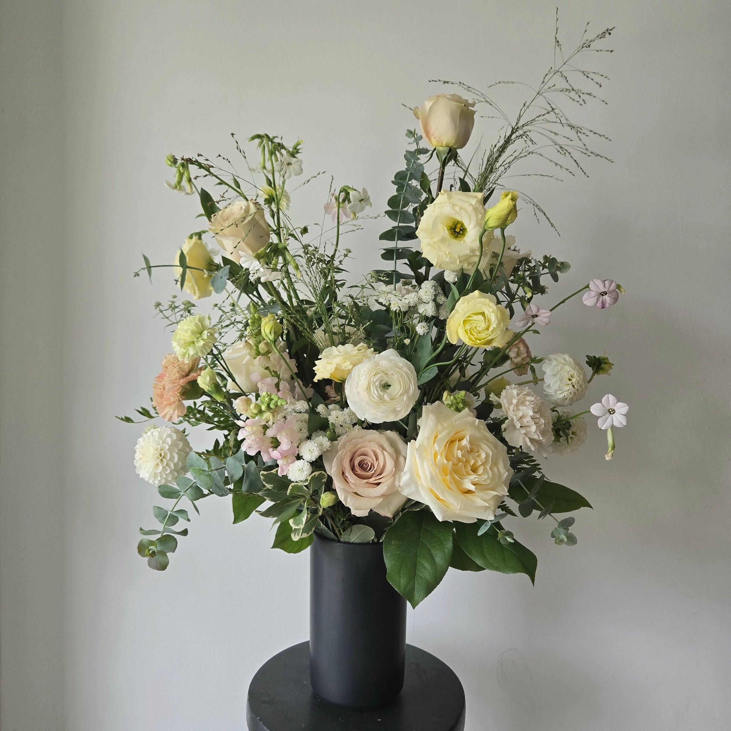 Made to order, Designers choice Sympathy Arrangement. Each arrangement combines elegant blooms in soft muted tones, chosen for their timeless beauty and meaningful symbolism, providing a thoughtful way to convey your compassion and respect.