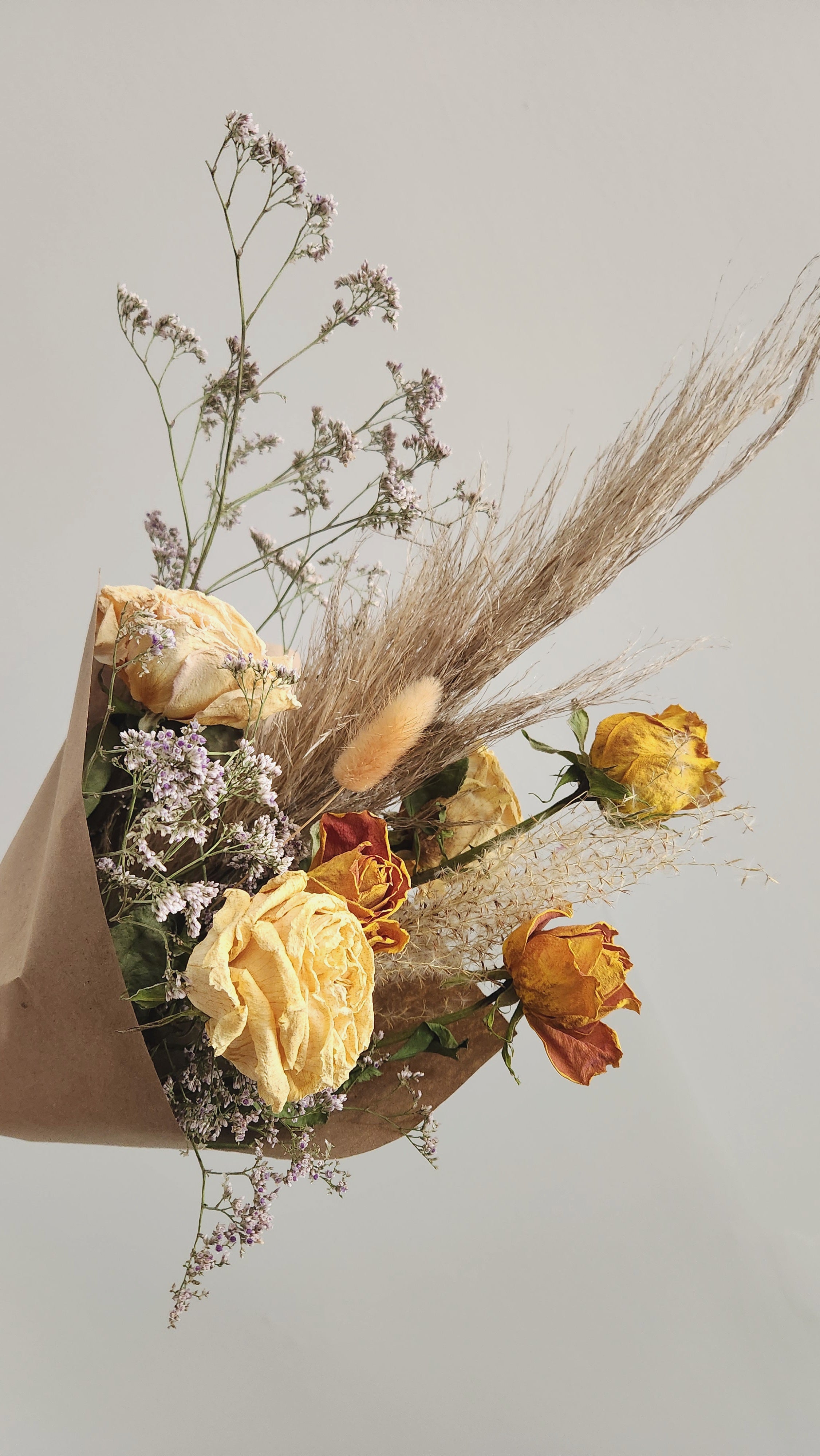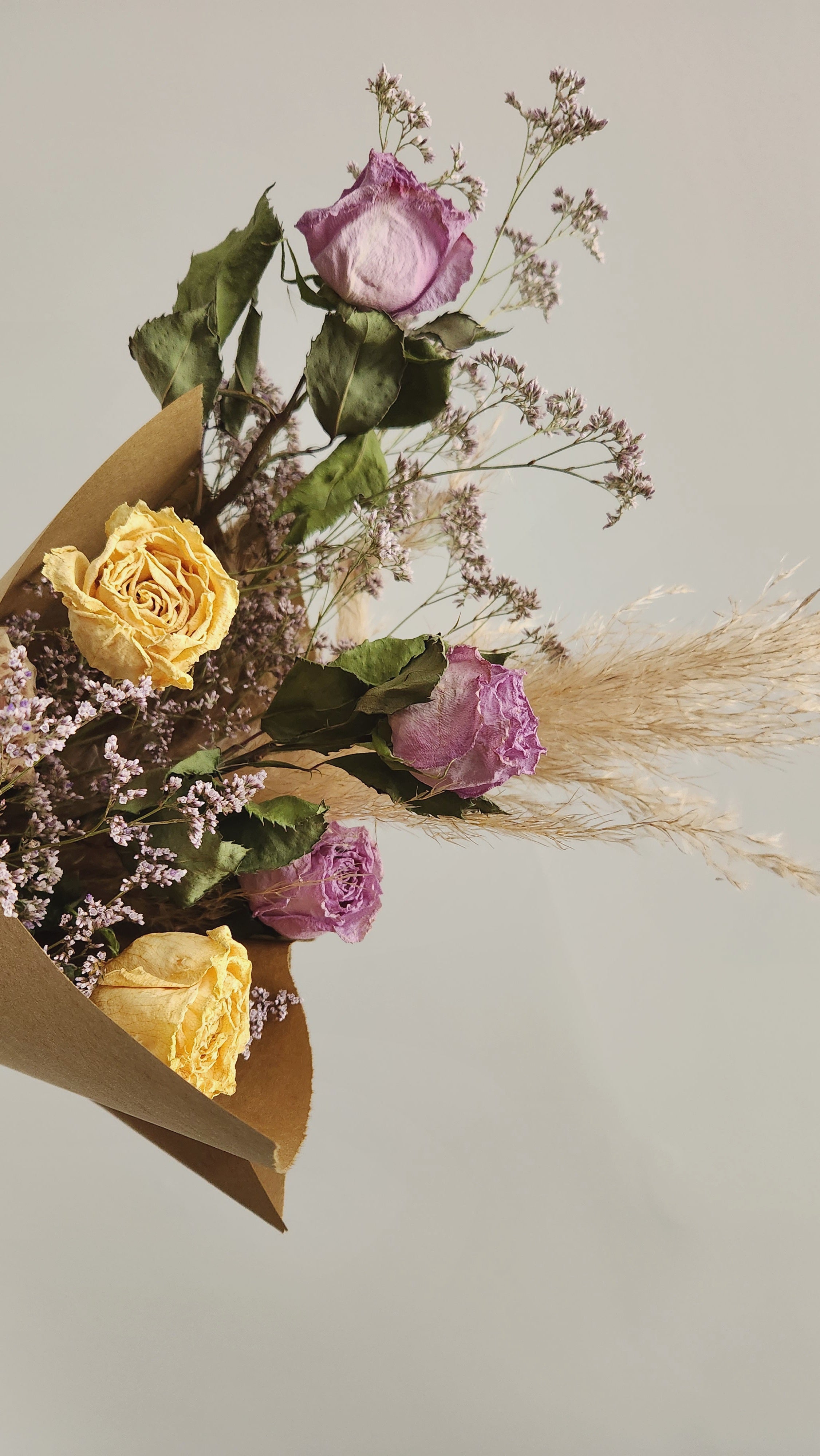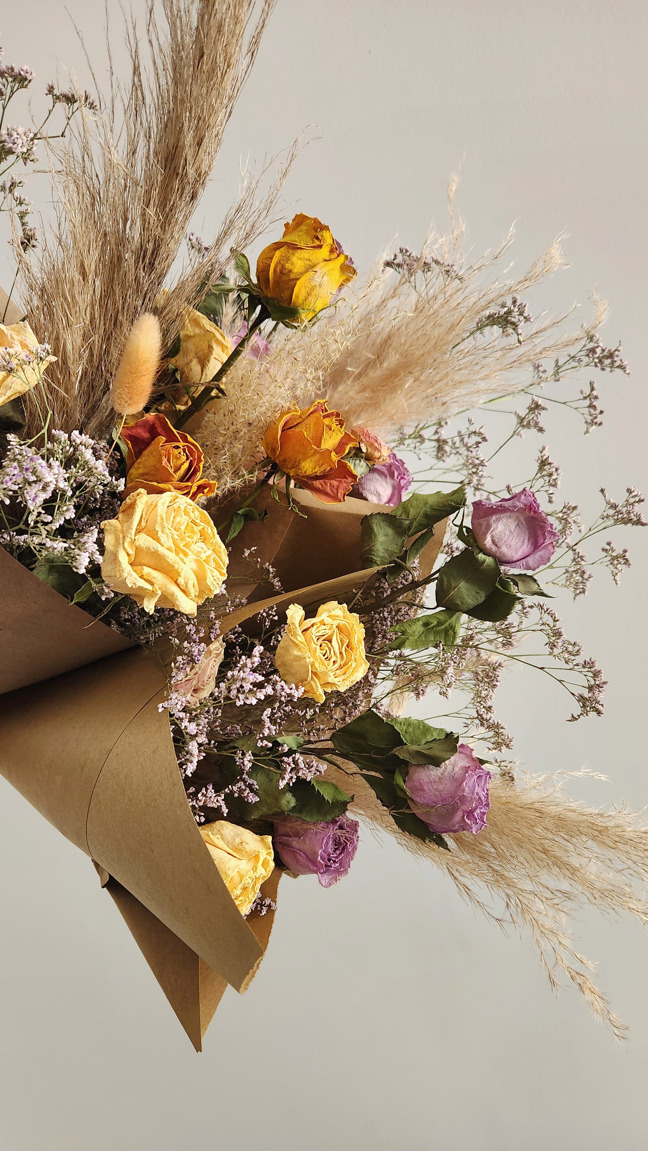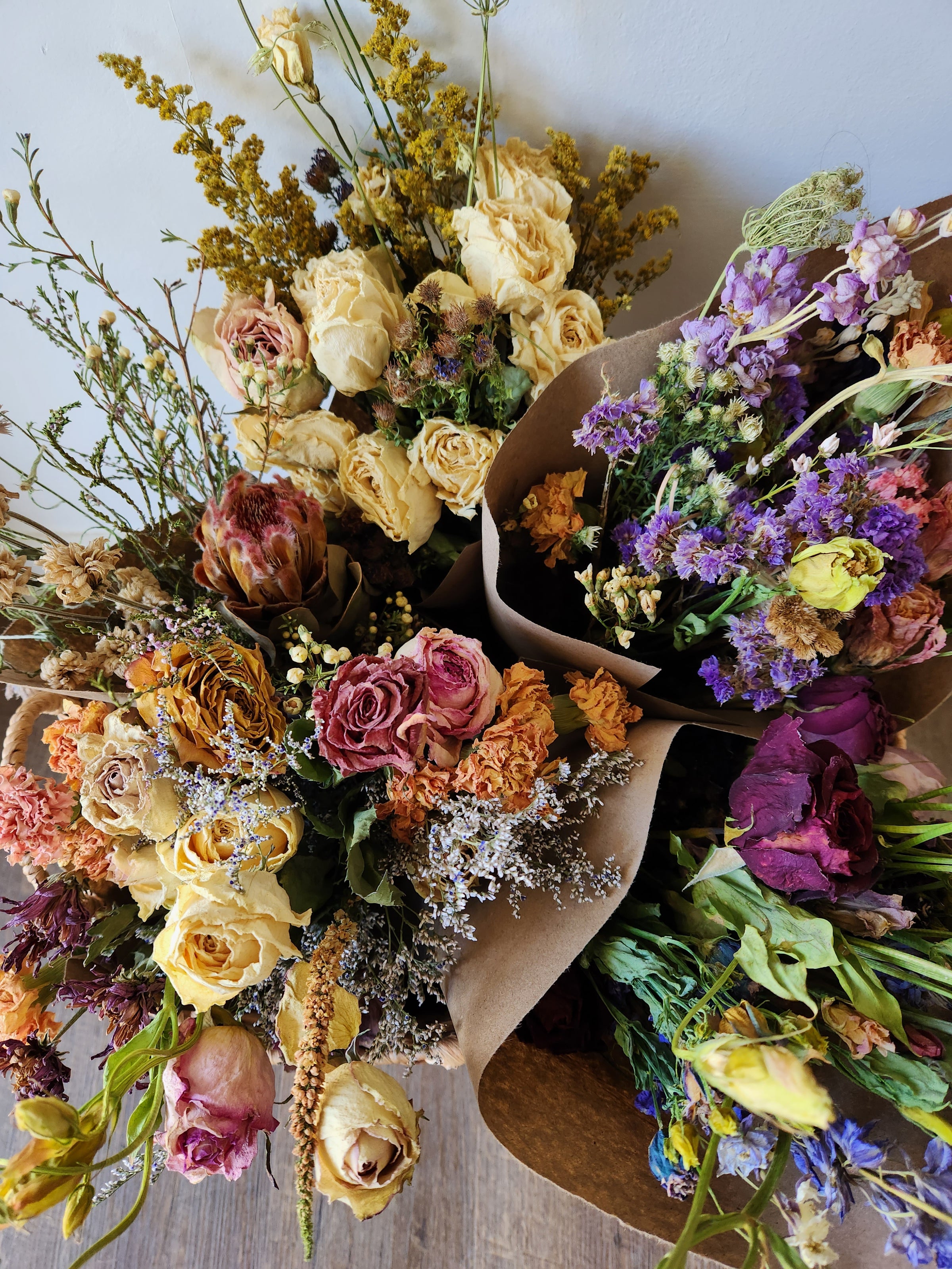 Give us a little direction in the orders notes as to colour preference and our designer's will pick the prettiest dried flowers available at time of fulfillment.