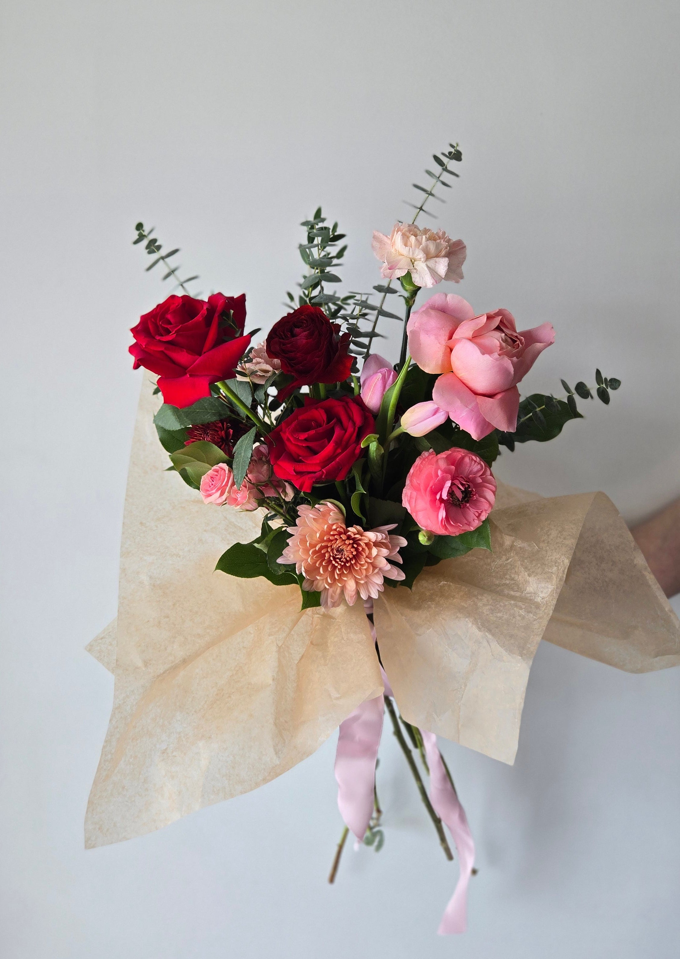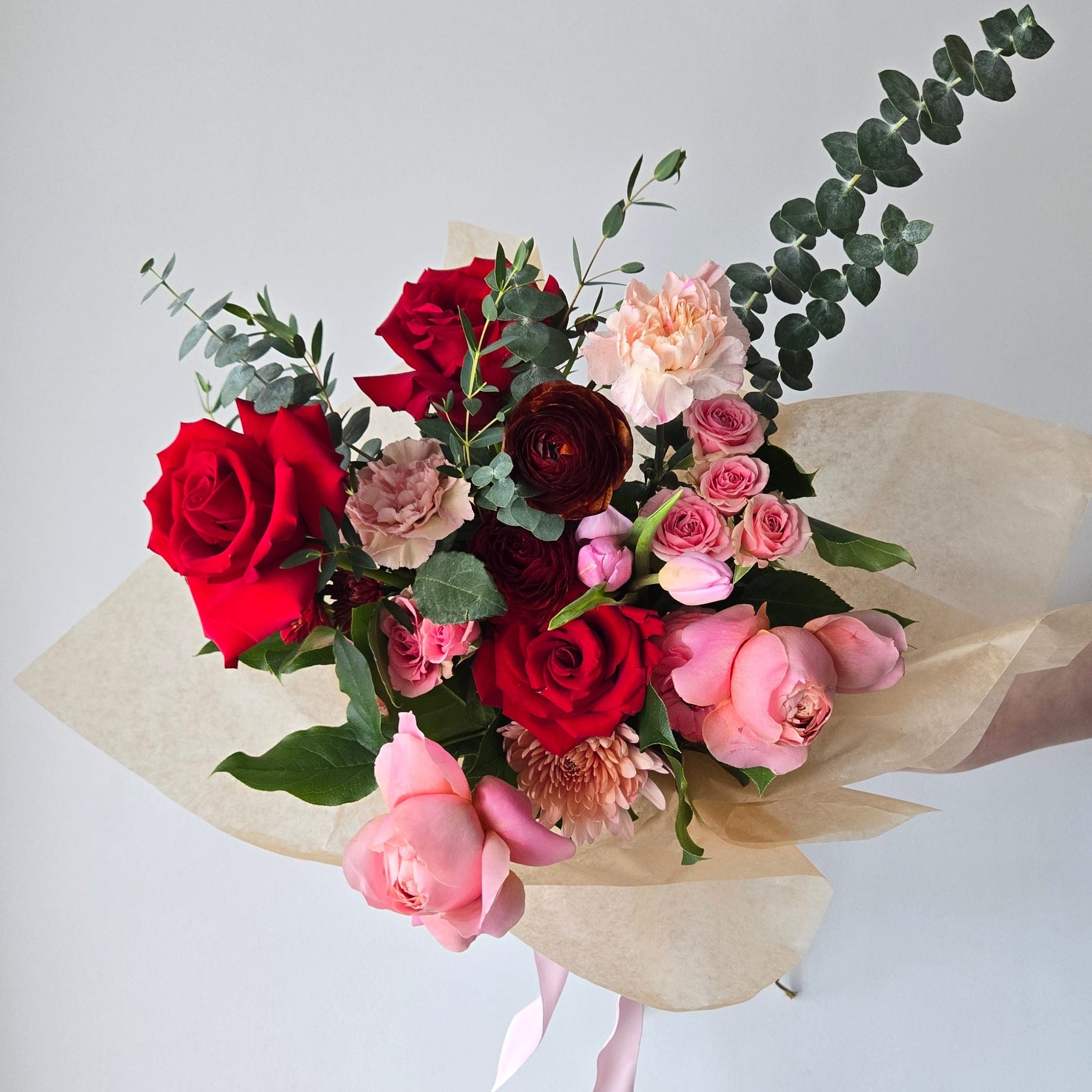 Romantic Valentine's Day Flowers featuring rich reds, blush and pink tones and seasonal greenery. Artfully designed and wrapped in our signature style.