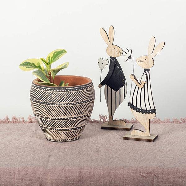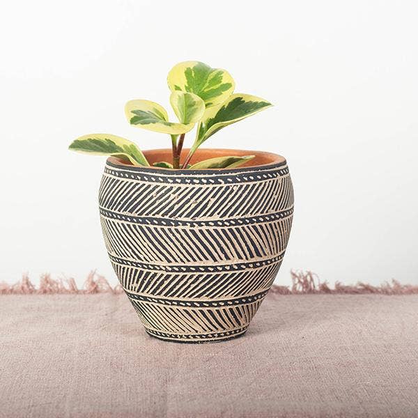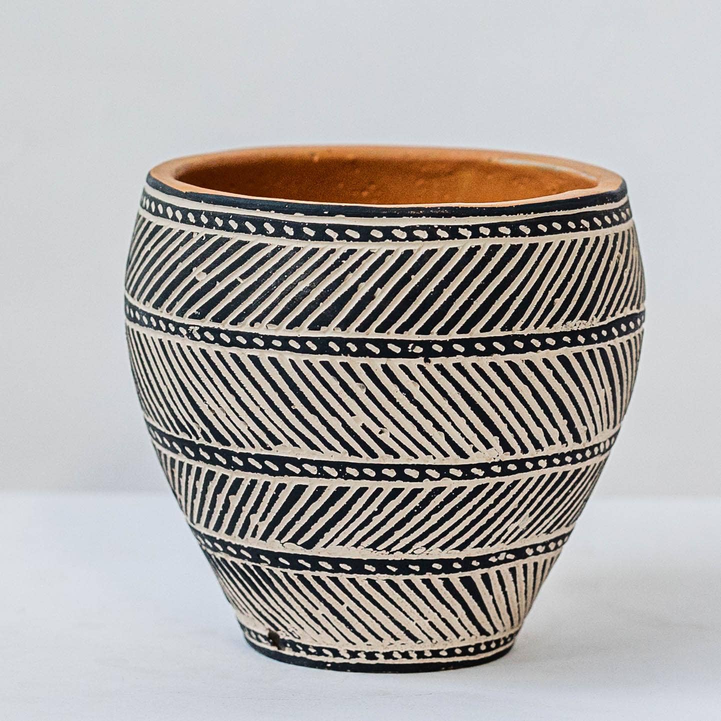 Flower pot with engraved pattern. Black and beige colours - terracotta material