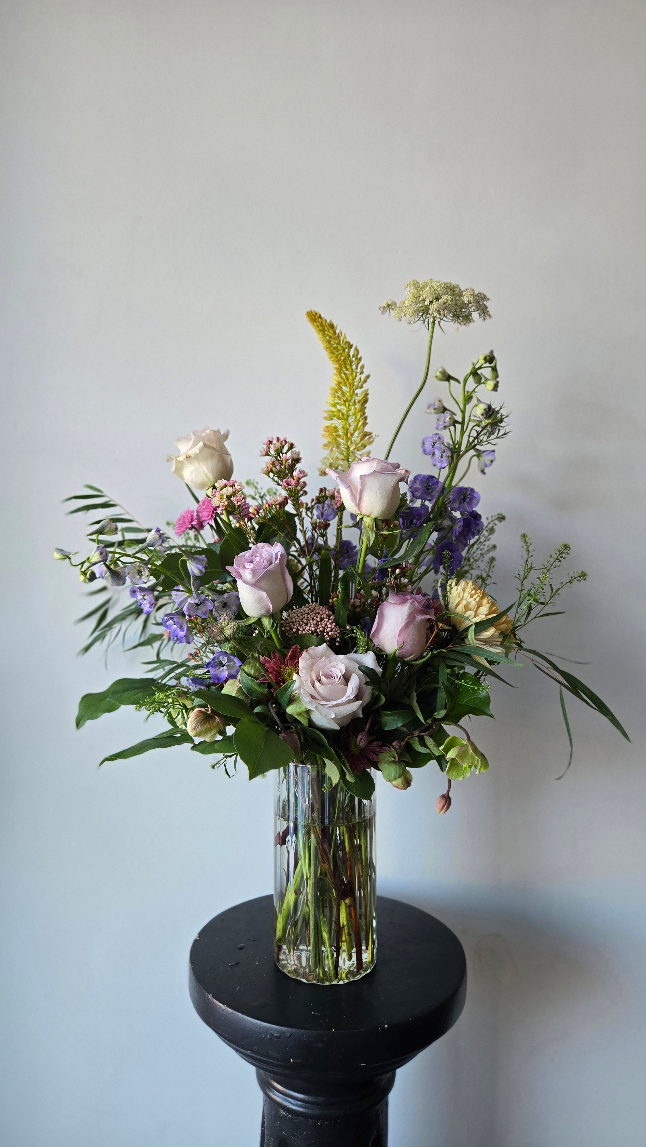 Made to order artfully arranged blooms in a clear ribbed glass vase.
