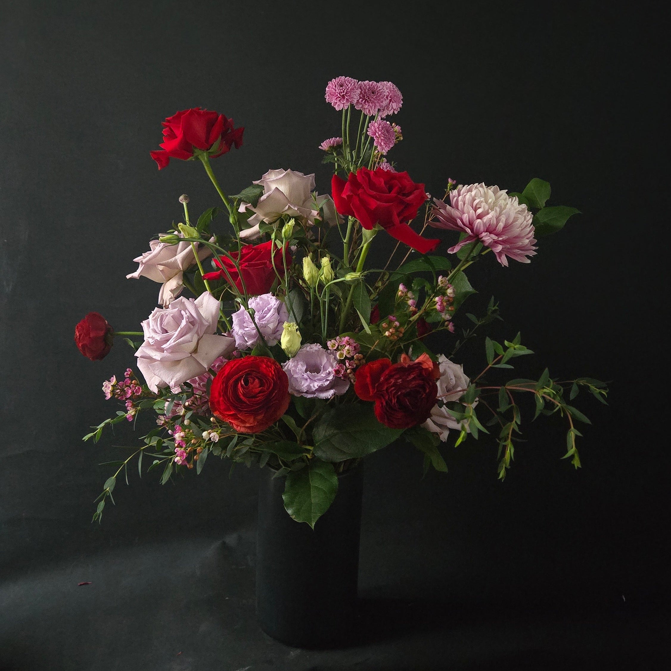 Romantic Valentine's Day Flowers featuring rich reds, burgundy and lavender tones and seasonal greenery. Artfully designed in a sleek black ceramic vase