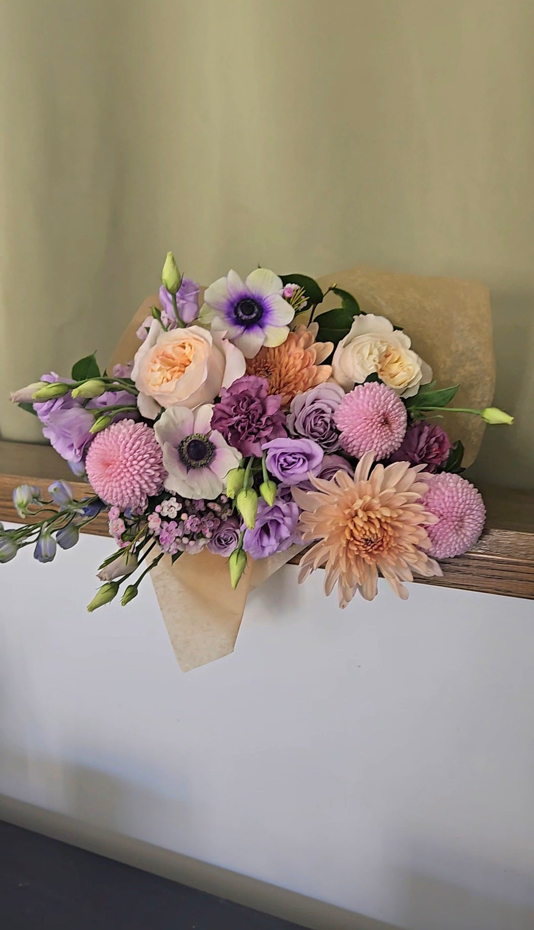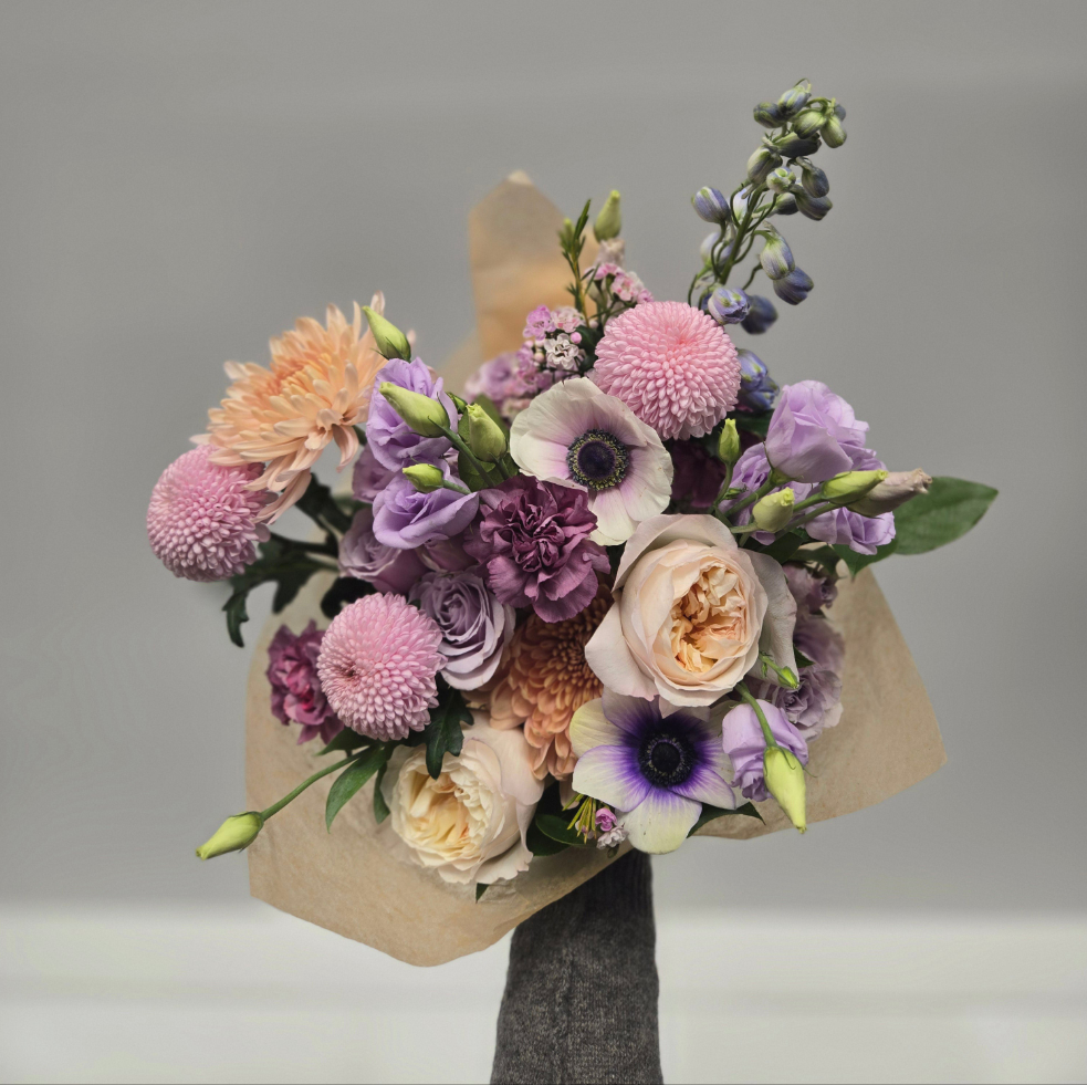This hand tied bouquet is artfully designed in muted pastel tones, wrapped, and ready to be placed into your vase.