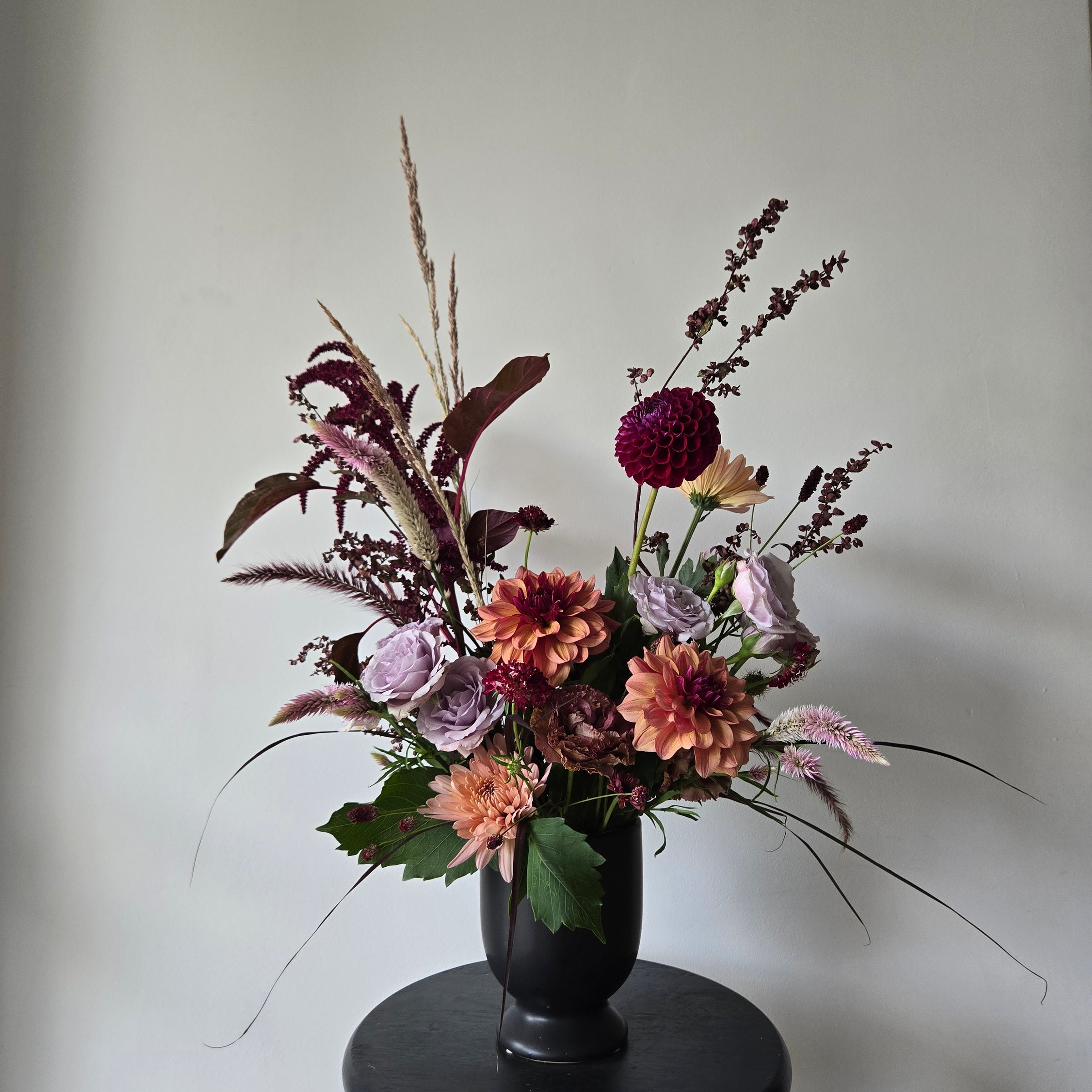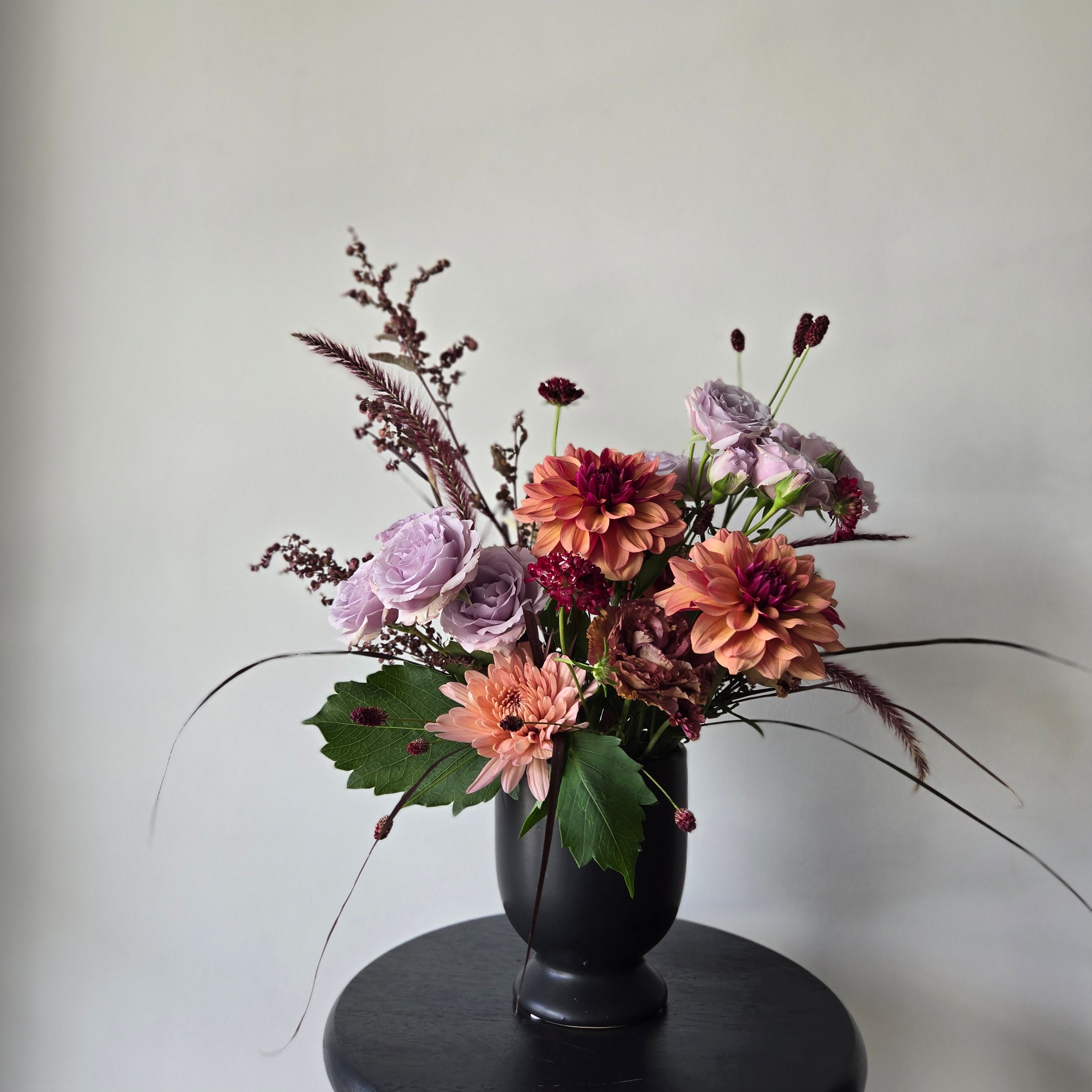 Seasonal blooms artfully arranged. Perfect as a centerpiece or on an entryway table. Send as a gift or add to your tablescape while entertaining guests!